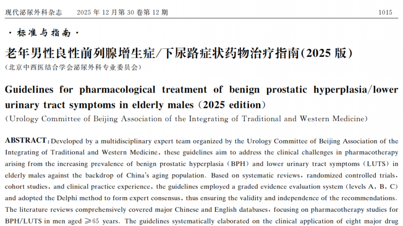 据了解,随着我国人口老龄化进程的加快,老年男性良性前列腺增生症(BPH)及其相关下尿路症状(LUTS)的发病率逐年上升,已成为重要的公共卫生问题。药物是治疗的重要手段,可以改善症状并提高患者生活质量。基于此,北京中西医结合学会泌尿外科专业委员会组织多学科专家团队制订了《指南》,为老年男性良性前列腺增生症/下尿路症状治疗提供了诊疗依据。