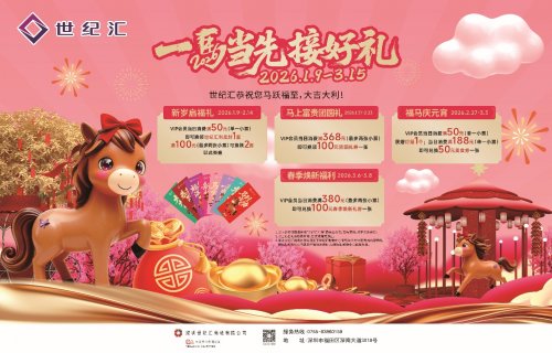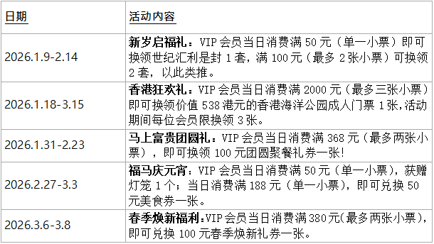 世纪汇VIP会员专享“一马当先接好礼”优惠大促玩转整个新年,即日起-2月14日, 当日消费满额50元即可换领世纪汇精美马年利是封1套,满100元可换领2套,领完即止。香港海洋公园门票大放送,1月18日-3月15日,VIP会员当日消费满2000元即可换领价值538港元的香港海洋公园成人门票1张,活动期间每位会员最多可换3张,与家人畅游海洋公园,体验香港年味。1月31日-2月23日,VIP会员当日消费满368元即可换领100元聚餐团圆美食券一张。更有“福马庆元宵”, 2月27日-3月3日VIP会员当日消费满50元即可获赠灯笼一个;满188元即可兑换50元轻餐美食券一张。春来焕新,三八节为顾客呈现消费满380元即可换领100元焕新券,餐饮和美容美发指定商户品牌抵现使用,新春精彩福利享不停。(活动细则详见下文活动日程)