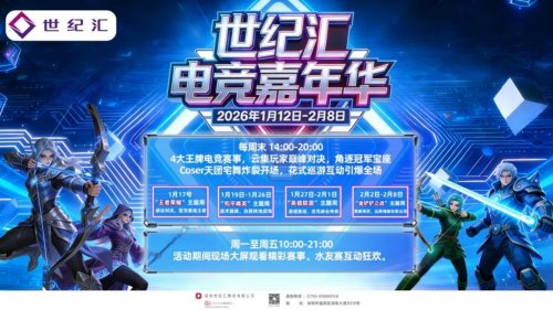 即日起至2月8日,「世纪汇电竞嘉年华」城市赛召唤全网电竞英雄集结,王者荣耀、和平精英、英雄联盟及金铲铲之战四大电竞主题轮番引爆,一站式满足所有玩家的终极幻想! 每周工作日大屏直击顶级赛事,同时现场报名组队开黑,参与水友赛互动狂欢,抢占周末决赛名额!周末更有巅峰对决,角逐冠军宝座;Coser天团宅舞炸裂开场,花式巡游互动引爆全场;专业电竞解说实时热血复盘,带您沉浸式体验职业赛场!