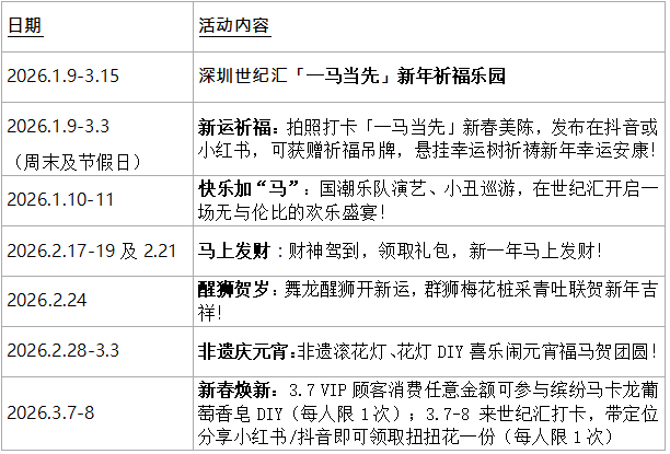 深圳世纪汇 – 「一马当先接好礼」春节促销活动日程: