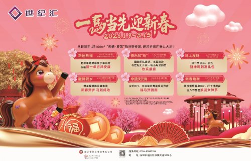 马跃福至,1月9日至3月15日深圳世纪汇「一马当先」春节吉祥纷呈,以原创萌马IP“焦糖·夏茉”为主角,配以逾3米高的“好运发发”幸运树和幸福浪漫桃花园,打造新春五大祈福体验场景!活动期间,一套8款利是封套满额赠,更有多重优惠礼遇,大家一起福气满满过新年!