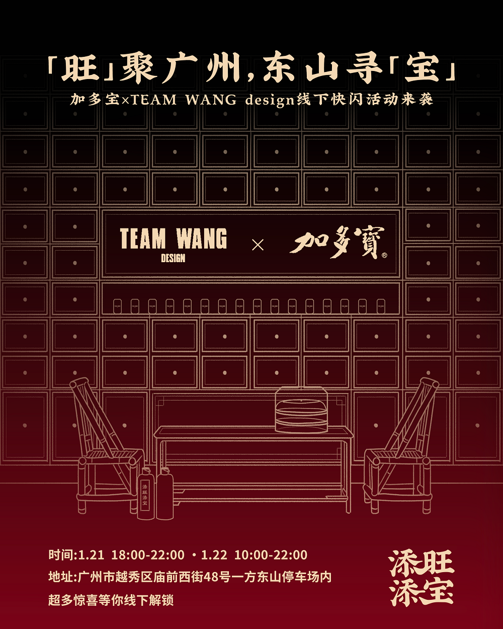 近日,国民凉茶品牌加多宝与多元时尚高街品牌TEAM WANG design跨界携手,推出“加多宝×TEAM WANG design新春联名系列”,更以此为契机打造线下快闪活动,让品牌跨界的惊喜从产品直达消费者身边。1月21日至1月25日,在广州潮流青年聚集地东山口,双方将打造“最有年味的潮流快闪店”,让“新年添旺添宝”的祝福从线上拓展至线下,开启沉浸式新春潮玩体验。
