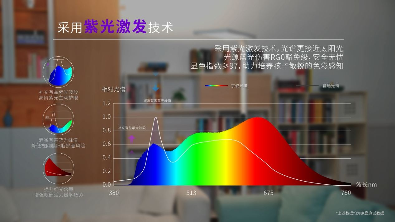 除了光线分布方式,光的质量本身更是护眼的关键。京瓷护眼落地灯KF-001WH采用“紫光激发”技术,补充400-420nm可见紫光波段,相较于传统蓝光激发,其光谱更连贯、更贴近自然太阳光。同时,产品显色指数Ra≥97,能高度还原物体真实色彩。色彩呈现鲜活、准确,带来真实自然的视觉感受。从而为青少年、办公人群等高频用眼群体,提供了一套兼顾视力呵护与舒适照明的解决方案。
