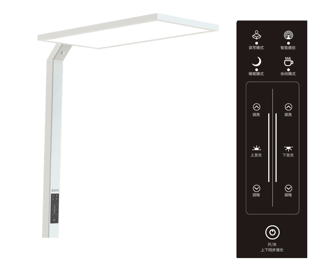 京瓷护眼落地灯KF-001WH搭载红外人体感应技术,支持3.5米范围内自动唤醒,离席15分钟后自动休眠,实现“人来灯亮,人走灯熄”的自在体验,节能省心。产品采用上下光源独立调节设计,上光源通过漫反射可照亮天花板,下光源可覆盖作业区域,双重优化整体光环境,避免局部明暗反差,实现全局照明与护眼。