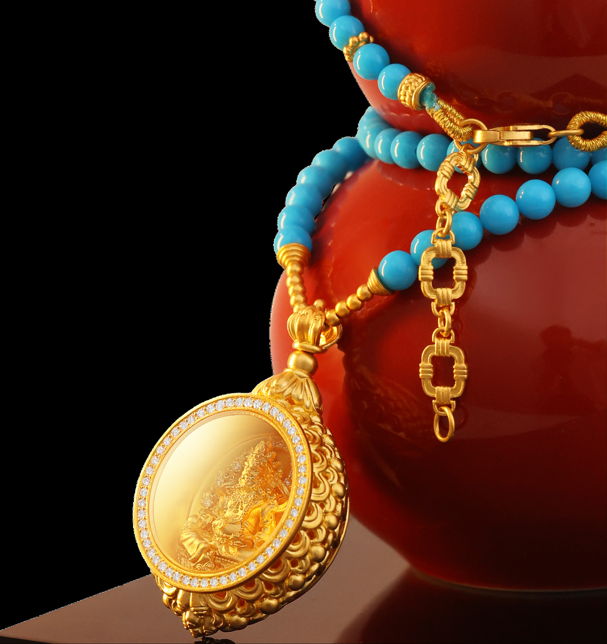 典藏之作「绿松石黄财神嘎乌盒吊坠」,更是一件将“见微知著”价值观发挥到极致的典范。以“无色财神之首”的黄财神形象为核心灵感,将招财纳福、守护安康的吉祥寓意,凝练于登峰造极的微雕微镶工艺之中。吊坠的核心挑战与荣耀,在于其黄金微雕工艺:工匠需在仅4mm的黄金材质上为黄财神完成“开脸”。