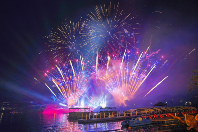 最值得期待的当属海上花火大会,巨型烟花在夜空绽放,倒映湖面,营造出震撼的视觉盛宴。璀璨烟花映照湖面,成为无数游客相机里的隽永记忆。而寄愿云端·天灯祈福活动则让家人共同写下新年愿望,在浪漫氛围中放飞美好期许。