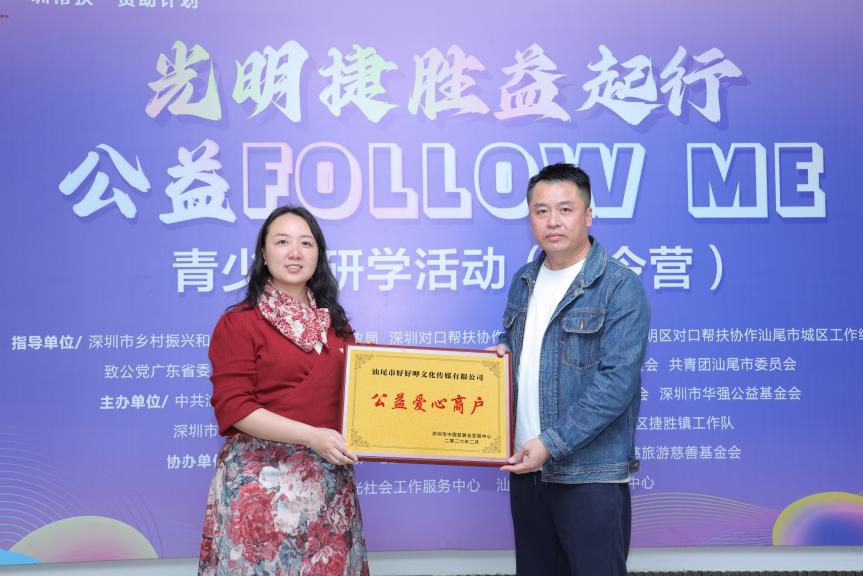 此外,深圳市中国慈展会发展中心副秘书长许晓君为爱心商家汕尾市好好呷文化传媒有限公司总经理刘庆志颁发“公益爱心商家”牌匾,感谢其作为在地力量所提供的坚实支持。