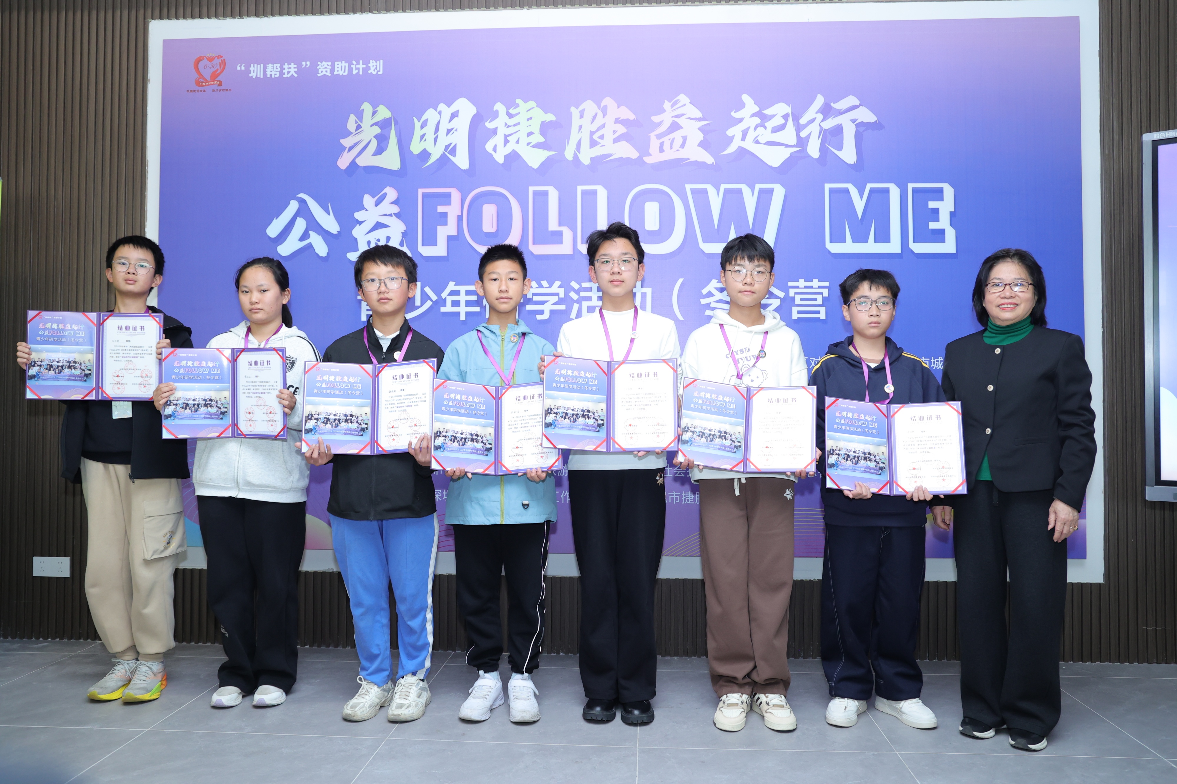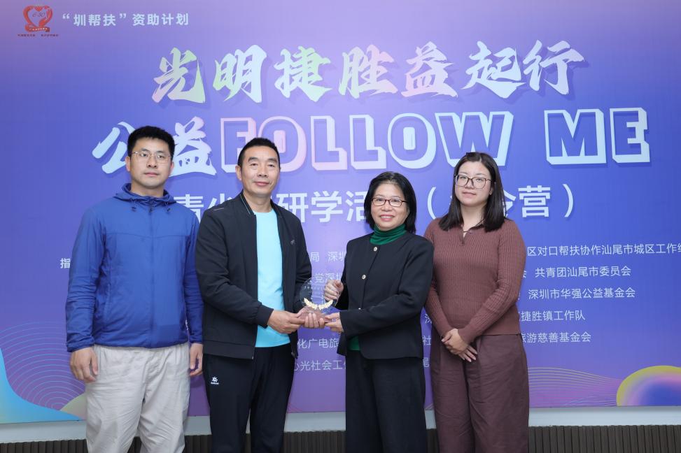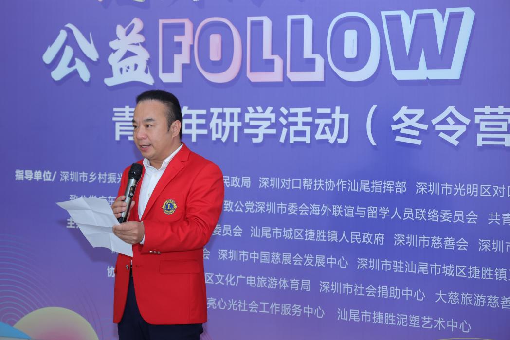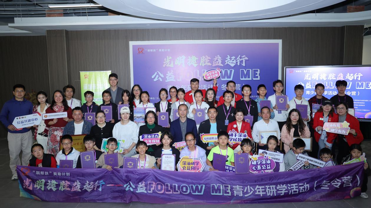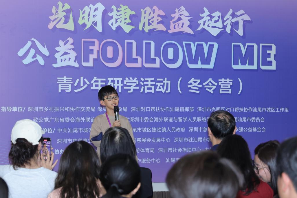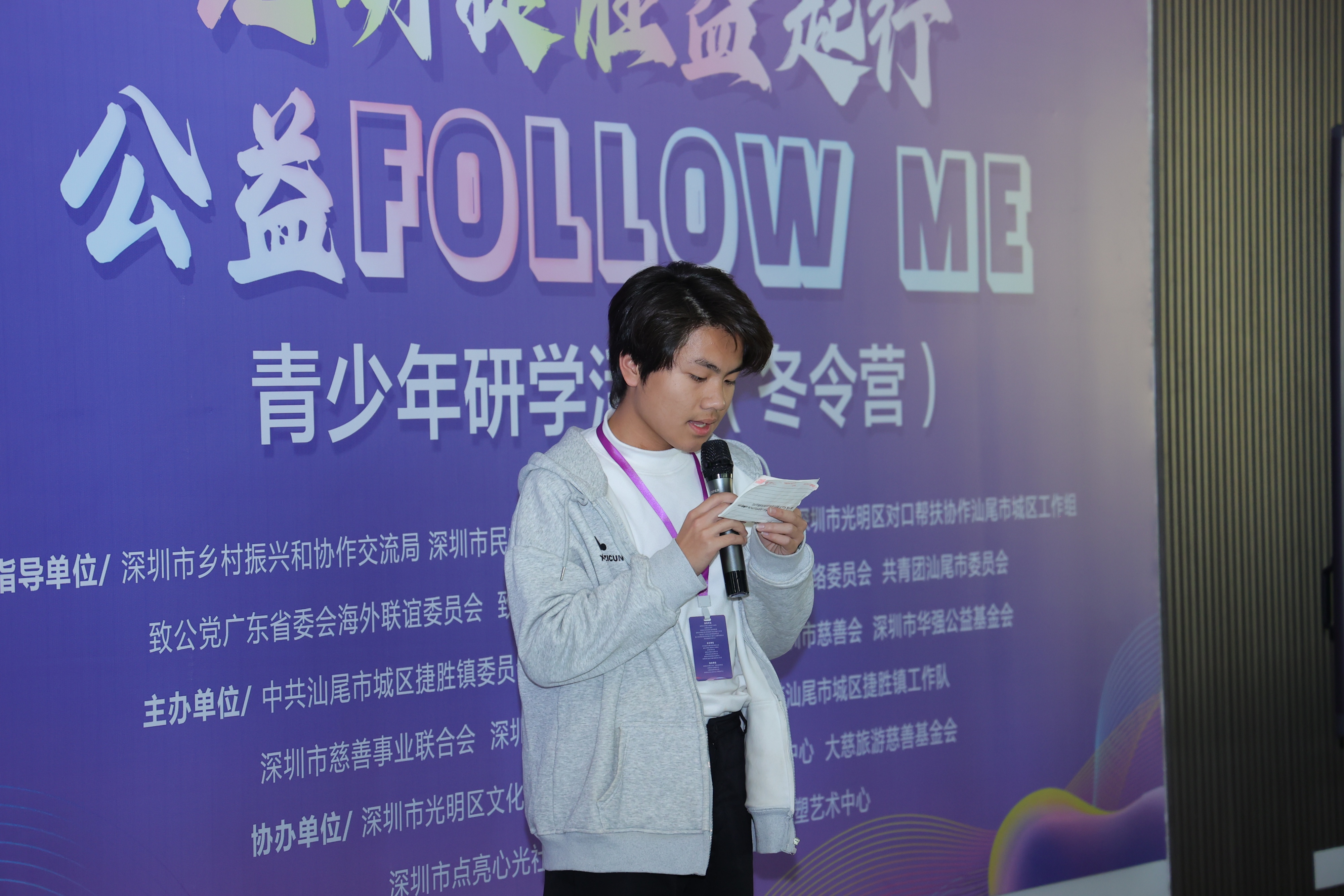 2月5日下午,光明捷胜益起行——公益FOLLOW ME青少年研学活动(冬令营)闭营仪式在汕尾市城区捷胜镇圩镇客厅举行。汕尾市城区副区长林史谦,深圳驻捷胜镇帮扶工作队符仕春、张婷婷、邓永才,深圳市慈善行业联合党委书记、深圳市慈善事业联合会常务副会长刘国玲,深圳市广电公益基金会理事长庞玮,深圳市中国慈展会发展中心副理事长兼秘书长郭云霞,深圳狮子会会长特别助理、社区服务委员会主席魏欣新,深圳狮子会深汕服务队队长陈陆,深圳市慈善行业联合委员会办公室主任、深圳市慈善事业联合会支部委员会书记王鑫,深圳市中国慈展会发展中心副秘书长许晓君,香港中文大学(深圳)学生事务处助理经理、校团委委员易碧帆,汕尾市好好呷文化传媒有限公司总经理刘庆志等主协办单位代表、捐赠企业基金会代表和全体学员出席。