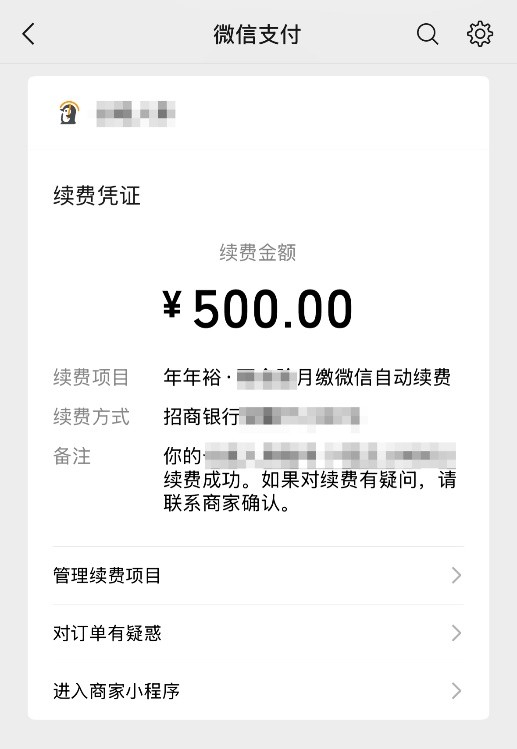 (自动续费成功后的凭证和微信通知)