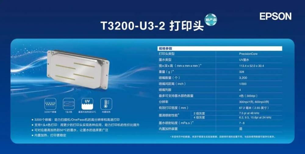 该设备搭载爱普生最新研发的T3200-U3-2打印头,最大打印幅宽可200cm,打印速度最高可达160㎡/h。这款全新升级的打印头内置3200个喷嘴,可同时实现分辨率与打印速度的双重提升;其支持单头四色打印,以更少的打印头配置满足各类应用需求,显著提升设备性价比。