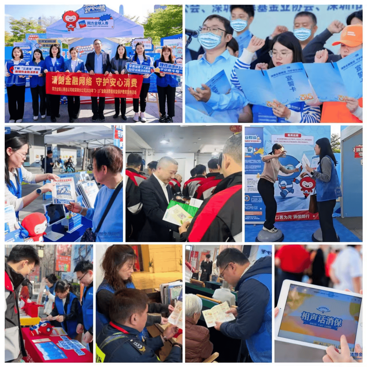 同方全球人寿总公司及其深圳分公司金融“青骑兵”志愿服务队走进深圳中心书城联手打造了一场别开生面的金融教育盛会,通过平衡大比拼、AI智能体、消保漫画报等趣味互动将金融消保典型案例转化为可参与、可互动的实体体验,让市民在趣味探索中学习金融知识、提升风险防范能力;江苏分公司走进南京八卦洲,面向农村居民尤其是老年群体通过方言讲解,将复杂的金融知识转化为通俗易懂的“家常话”,合力在乡村一砖一瓦地筑牢金融安全的堤坝;广东分公司创新推出“午间驿站”宣教模式,利用中午充电、派件高峰时段,在机构附近新能源车充电站、外卖柜集中区域设立“金融宣教驿站”,向“两司两员”群体精准宣教,实现了“充电蓄能”与 “知识补给”的双向赋能,切实弥补“两司两员”金融知识短板;青岛分公司走入楼宇商圈深入开展金融知识宣传活动,通过写字楼大堂电子广告屏持续轮播公司宣传海报,现场发放讲解风险提示折页等,向写字楼出入人员普及保险消费“三适当”原则,提醒大家防范非法金融中介陷阱;湖北分公司联合同业机构走进东湖樱花园,通过消保连连看、心肺复苏应急演练等互动环节面向广大市民群众开展沉浸式、多元化金融知识普及宣教活动,让群众在轻松互动中学习消保知识、强化风险意识;上海分公司走进嘉兴路党群服务中心,女神节暖心开讲,专为中老年女性打造健康与消保公益讲座,科普女性健康养护、科学养生、合理投保,教大家认清金融诈骗、守住养老钱,守护健康与财富,安心享晚年;山东分公司走进济南市大明湖街道舜井社区联合济南广播电视台及多家同业保险机构,为一线快递外卖从业人员送上精准化金融安全知识;北京分公司走进北京王府井东方广场小邮局,重点面向快递员群体普及金融安全知识,将金融服务阵地延伸至新就业形态劳动者一线;福建分公司于中央第五街为企业工作人员带来一场实用的金融消保活动,通过讲解折页,详细阐释保险消费“三适当”原则,引导企业员工理性选择保险产品。浙江分公司走进杭州市余杭区仁和镇云会村,通过设置咨询展台、一对一答疑解惑等多种形式,将实用的金融知识与防骗技能送到乡村百姓身边,切实筑牢基层金融安全防线。四川分公司开展“进社区”“进顺丰”线下宣传专项活动,志愿者零距离为社区人员、快递人员提示作为金融消费者时应知晓并维护自身重要权益,全面提升风险识别与防范能力;深圳分公司在深圳市7/9号线红岭北站投放公益灯箱广告,让市民通勤路上就能轻松“充电”,便捷学金融防骗技巧。天津分公司走进在天津市复兴公园面向中老年市民、青少年儿童及家长发放教育宣传资料,并通过真实案例讲解、风险提示、互动问答等形式,助力提高群众自身和家人识别风险、防范诈骗的能力;河北分公司联合石家庄市长安区中山东路街道党工委及同业开展“金融消保进一线”的教育宣传活动,让金融知识精准触达服务前沿,为新就业群体撑起金融消费“保护伞”。