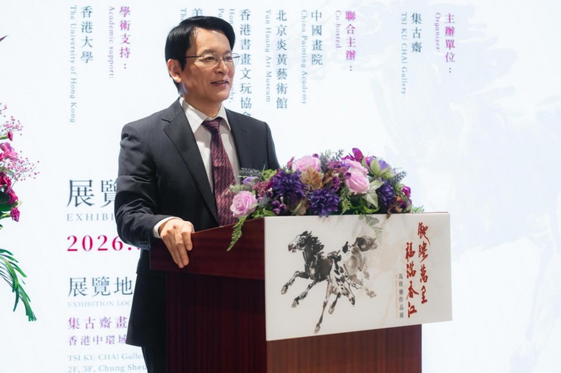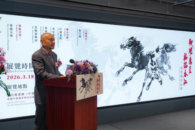 中国画院理事长乔雨先生在开幕式致辞中表示,三月香江艺术盛宴纷呈,中国画院联合主办此次展览,既是对香港艺术的致敬,也是中国水墨的一次精彩亮相。他介绍,马欣乐师从黄胄,深得长安画派精髓,又融汇中西,其笔下的马形态万千、气势磅礴,被誉为“徐悲鸿之后画马第一人”。其代表作《神驰九骏图》曾作为国礼赠予英女王,《驰骋风雪图》被美国克林顿总统收藏。乔雨先生指出,香港是中华文化通向世界的重要桥梁,相信马欣乐既承古意、又开新境的作品定能引发深刻共鸣。他寄语展览让更多市民和藏家感受中国水墨的创新活力,并祝愿香港文化繁荣“万马奔腾”。