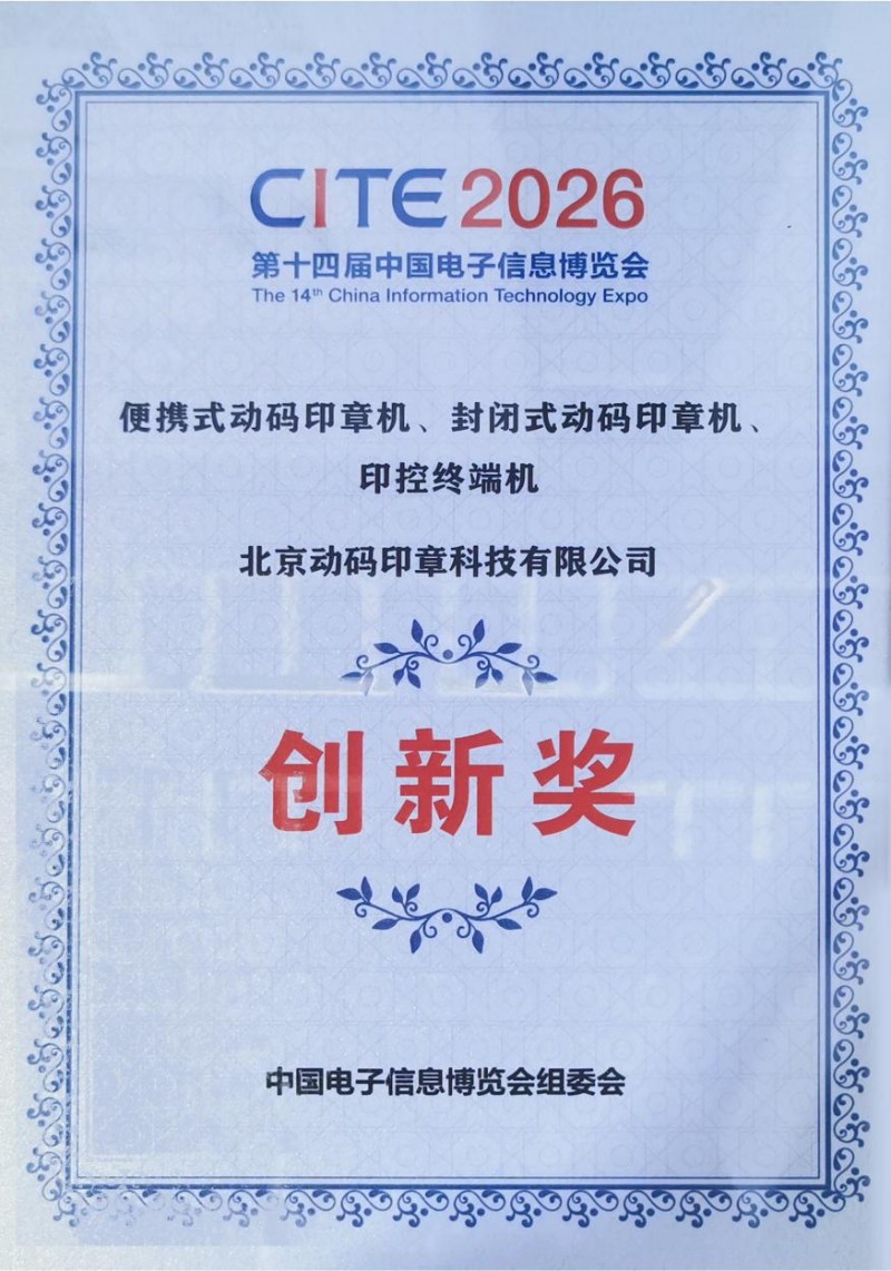 动码印章此次获奖的便携式动码印章机、封闭式动码印章机、印控终端机三款设备,是全场景安全防伪智慧印章解决方案的重要载体,覆盖集团公司便携办公、金融政务高安全、盖印全流程管控等多元场景,以AI驱动、印迹防伪、全程溯源等核心能力,破解传统印章易伪造、难管控、效率低等行业痛点。中国电子信息博览会创新奖是电子信息领域最具代表性的奖项之一,是电子信息产业的科技创新成果风向标。动码印章斩获“CITE 2026 创新奖”,标志着团队产品与技术得到了博览会专家、行业领域代表的高度认可,再度彰显动码印章在智慧印章领域的引领地位。