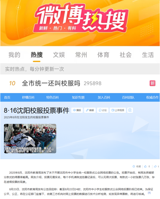2025年沈阳的校服统一款式投票事件,则暴露出该模式在民意征集环节的形式化问题。2025年8月,沈阳市教育局发布了关于开展沈阳市中小学生统一校服款式公众网络投票的公告。投票开始后,有网友质疑部分款式的得票率畸高,“全市统一还叫校服吗”话题冲上微博热搜。网友介绍,投票无需实名,每个手机清除浏览器记录后,可以无限次投票,有款式一小时涨票几万张,存在虚假投票的现象。11月,沈阳市在重启全市中小学生校服统一款式投票工作时,在同步发布的投票细则中明确设置“传播禁令”:相关投票要求严禁下发至家长群、班主任工作群等公开群组,仅可通过会议培训形式向班主任传达,违规引发舆情将对责任单位及个人严肃追责。此举引发广泛争议,不少家长和教育界人士指出,实质是“偷偷摸摸的假民主”,剥夺了家长的知情权与全社会的监督权。