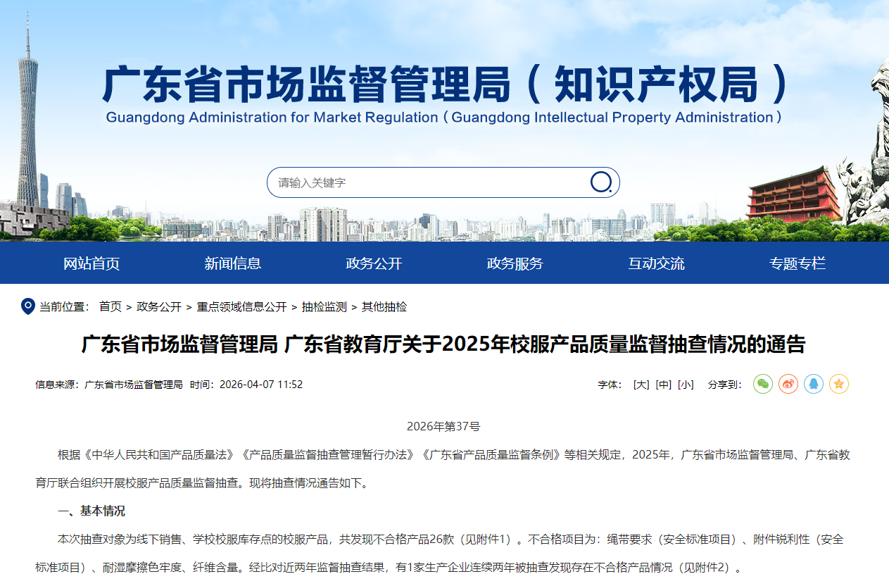 近日,广东省市场监督管理局、广东省教育厅联合发布关于2025年校服产品质量监督抽查情况的通告,通告显示本次抽检发现26款校服产品质量不合格,涉事企业包括佰森服饰、章凡服饰、萱菁纺织、金奴集团等多家校服生产企业,其中不乏产自佛山、东莞、湛江、阳江、惠州的本土校服生产企业。此次抽检结果让校服产品质量安全再次成为社会关注焦点,而佛山、东莞等地推行的校服统一款式市场化选购模式,也因涉事企业的出现引发公众对该模式质量管控、市场化运作等方面的质疑。