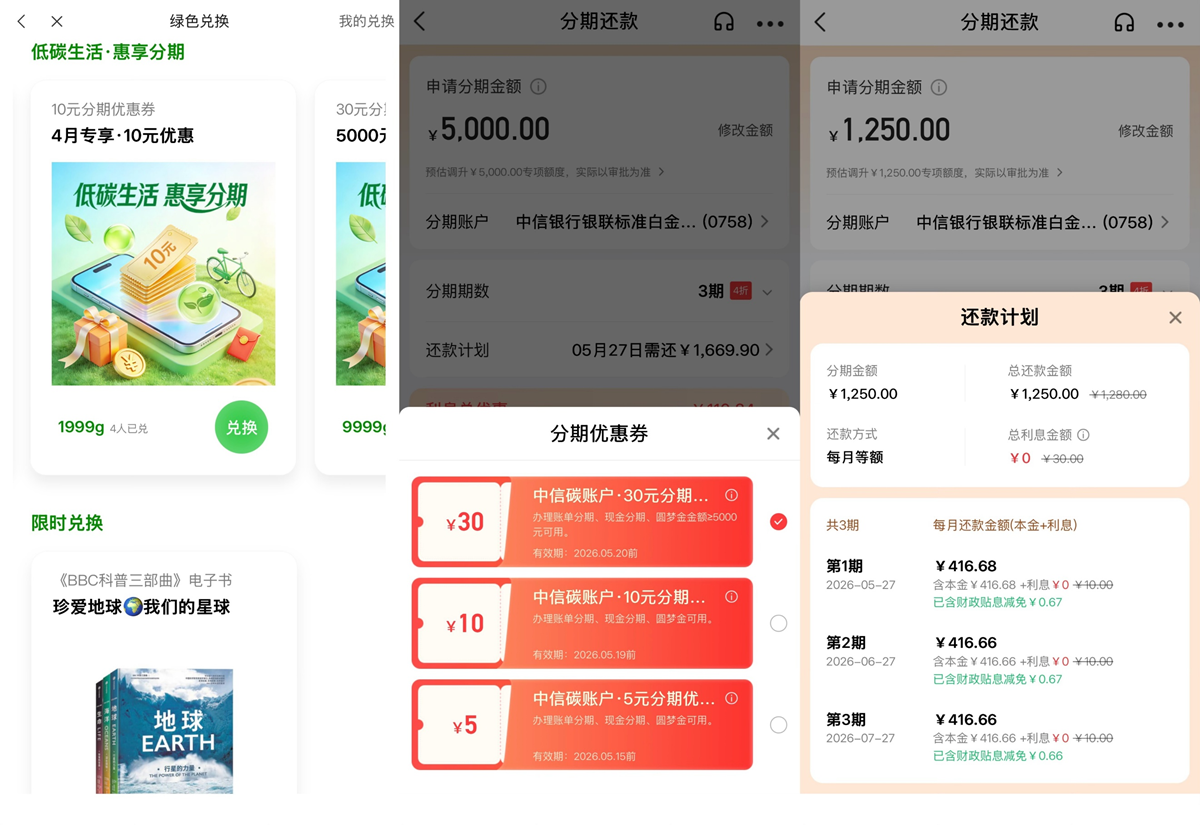 为进一步释放碳普惠的民生价值,“中信碳账户”基于科学核算体系,上线碳减排量兑换分期利息优惠券功能,让绿色生活的点滴积累转化为切实的金融福利。用户可凭借账户内累计的碳减排量兑换不同面额的分期利息优惠券,如999克碳减排量可兑换5元优惠券,1999克碳减排量可兑换10元优惠券,9999克碳减排量可兑换30元优惠券等,优惠券可用于抵扣办理账单分期、现金分期及圆梦金产品的分期利息。其中5元与10元优惠券无使用门槛,优惠金额可叠加国家财政贴息减免,助力用户享受低至0息的分期服务。