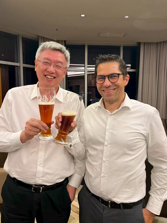 宝马高层赠送亿纬锂能董事长纪念啤酒杯