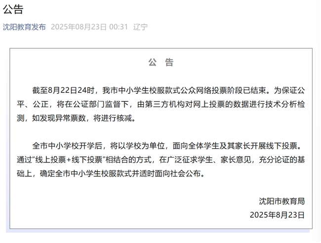 此次争议并非孤例。2025年8月,沈阳全市统一校服线上投票乱象凸显,投票无需实名、存在技术漏洞,部分款式短时间内票数暴涨数万,明显涉嫌人为操纵,相关话题一度冲上热搜。当地教育部门被迫叫停线上投票,委托第三方检测异常数据,并转为线上线下结合投票,但事件已严重冲击公众信任,也让“一市一款”的程序合理性备受拷问。然而,2025年11月线下投票启动后,争议并未平息。沈阳市在重启全市中小学生校服统一款式投票工作时,同步发布的投票细则中明确设置“传播禁令”:相关投票要求严禁下发至家长群、班主任工作群等公开群组,仅可通过会议培训形式向班主任传达,违规引发舆情将对责任单位及个人严肃追责。此举引发广泛争议,不少家长和教育界人士指出,实质是“偷偷摸摸的假民主”,剥夺了家长的知情权与全社会的监督权。