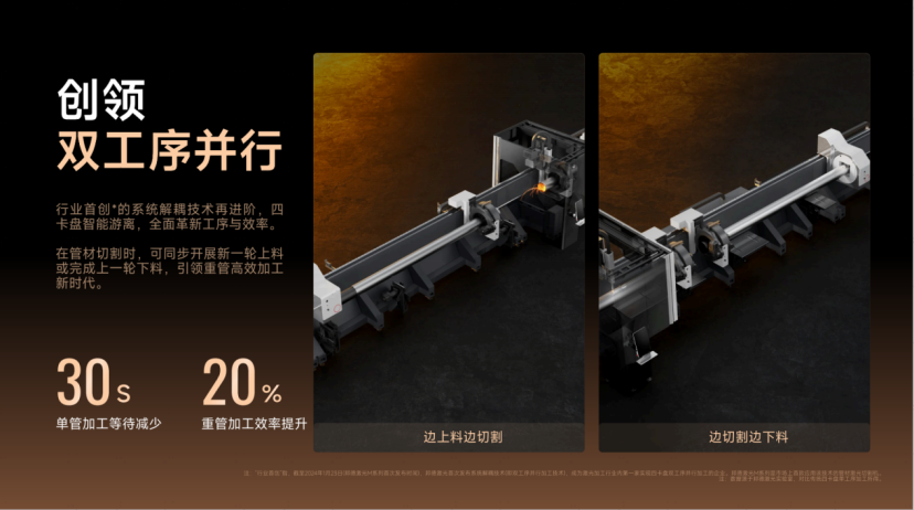 (*行业领创指截至2024年1月23日(邦德激光M系列首次发布时间),邦德激光首次发布系统解耦技术(即双工序并行加工技术),成为激光加工行业内第一家实现四卡盘双工序并行加工的企业。邦德激光M系列是市场上首款应用该技术的管材激光切割机。)