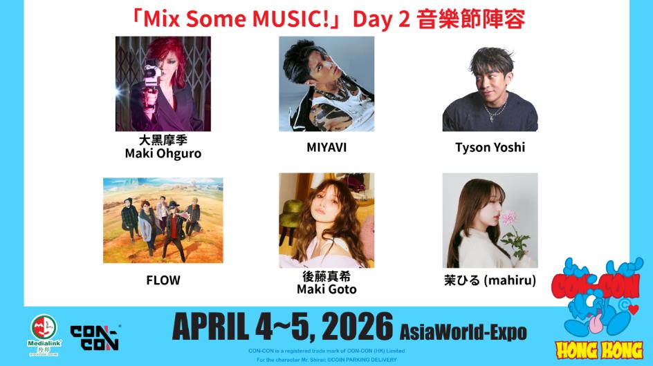 香港著名男团MIRROR成员ANSON KONG江𤒹生亦将为CON-CON®「Mix Some MUSIC!」带来惊喜。刚推出微电影的唱作歌手Tyson Yoshi、人气乐队晚安莉莉亦会于音乐会登场献唱,与现场观众乐迷投入炽热气氛。