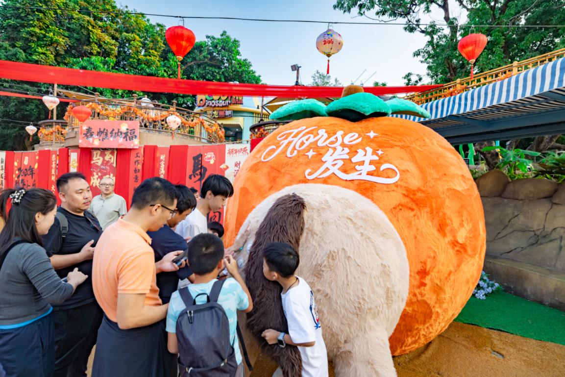 现场不再是简单的“看”,而是变成了“玩”。景区推出的“世界大赢家”互动活动,让游客通过参与游戏或在“马”主题装置“拍马屁”收集“马币”,增添了游园惊喜。园区以 “马”为主题的各类装置,如“拍马头”“拍马屁”打卡点前挤满了拍照互动的游客。